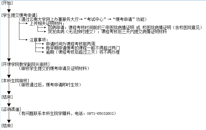 1.学生在云南大学网上办事服务大厅“考试中心”—“缓考申请”功能上提出缓考课程申请并上传相关证明材料。因病申请办理缓考的,需要上传相关课程考核时间前的三甲医院病情证明或校医院病情证明(含校医院意见);如因突发疾病无法按时提交申请的,应在课程考核后三天内提交缓考申请并上传相关病情证明材料,逾期将不再办理。