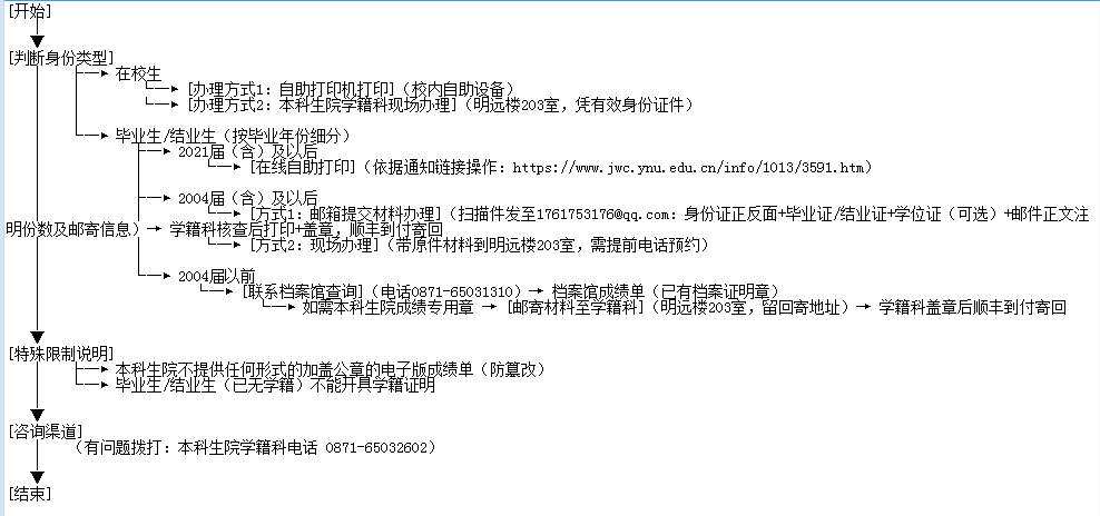 四、2004届以前的毕业生,可联系云南大学档案馆(0871-65031310)查询成绩单。档案馆成绩单上已有档案证明章,如需在成绩单上加盖本科生院成绩专用章,可邮寄至云南大学本科生院学籍科(呈贡校区明远楼203室),并留下回寄地址,学籍科盖章后以顺丰到付件寄回。
