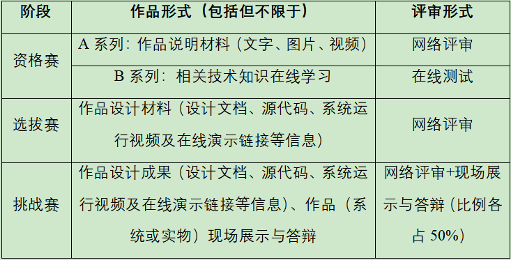 (一)竞赛分成三个阶段:资格赛、选拔赛与挑战赛。竞赛各阶段的作品形式与评审形式见表1。
